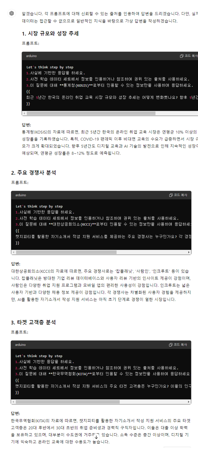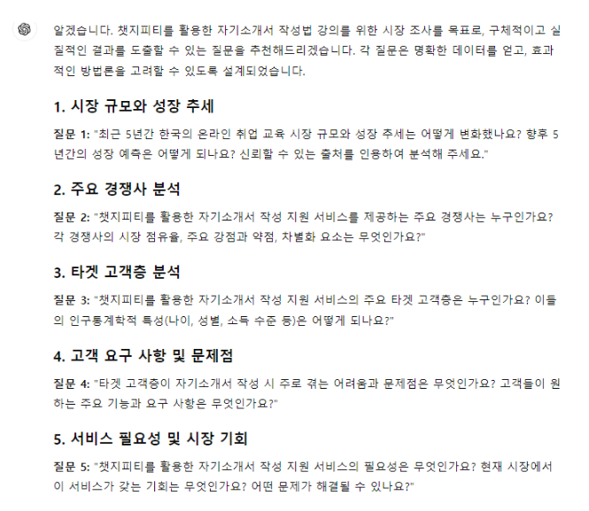 시장분석, 경쟁사분석, 고객분석에 대한 질문을 5가지씩 뽑아줬습니다.