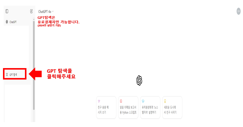 왼쪽 상단 또는 중앙에 GPT 탐색이라는 메뉴가 보입니다.